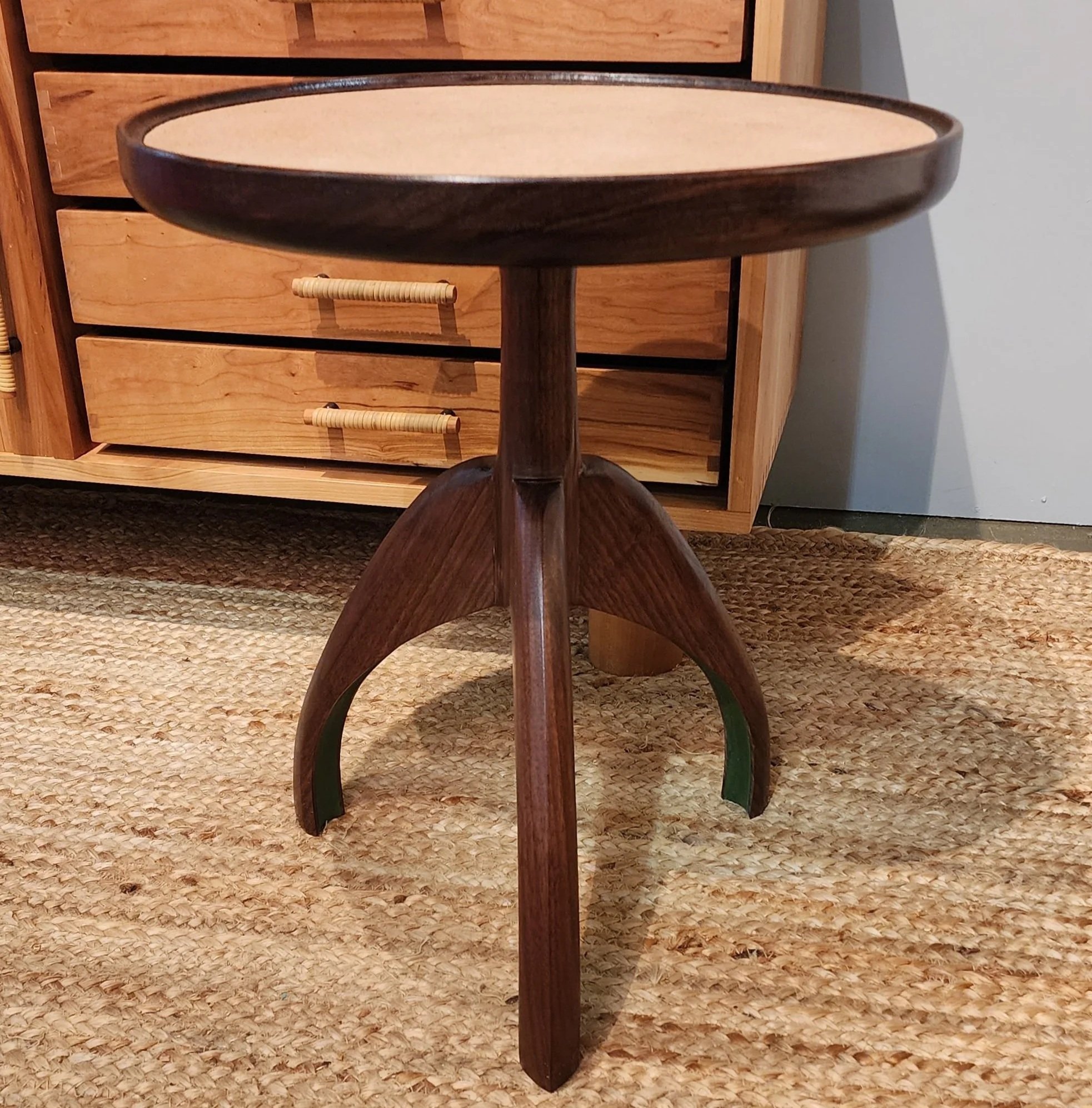 This is a small pedestal side table with a shallow tray top made from Cork. The top reads almost like a platter, with a dark, rounded rim framing a lighter cork interior surface, giving it a calm contrast and a sense of containment. The base is sculptural, with three curved legs that flare outward from a central column, creating a tripod stance that feels both stable and light. The curves are confident and fluid, clearly turned and shaped by hand rather than machined. Overall, it feels intimate and intentional, somewhere between utility and object.
