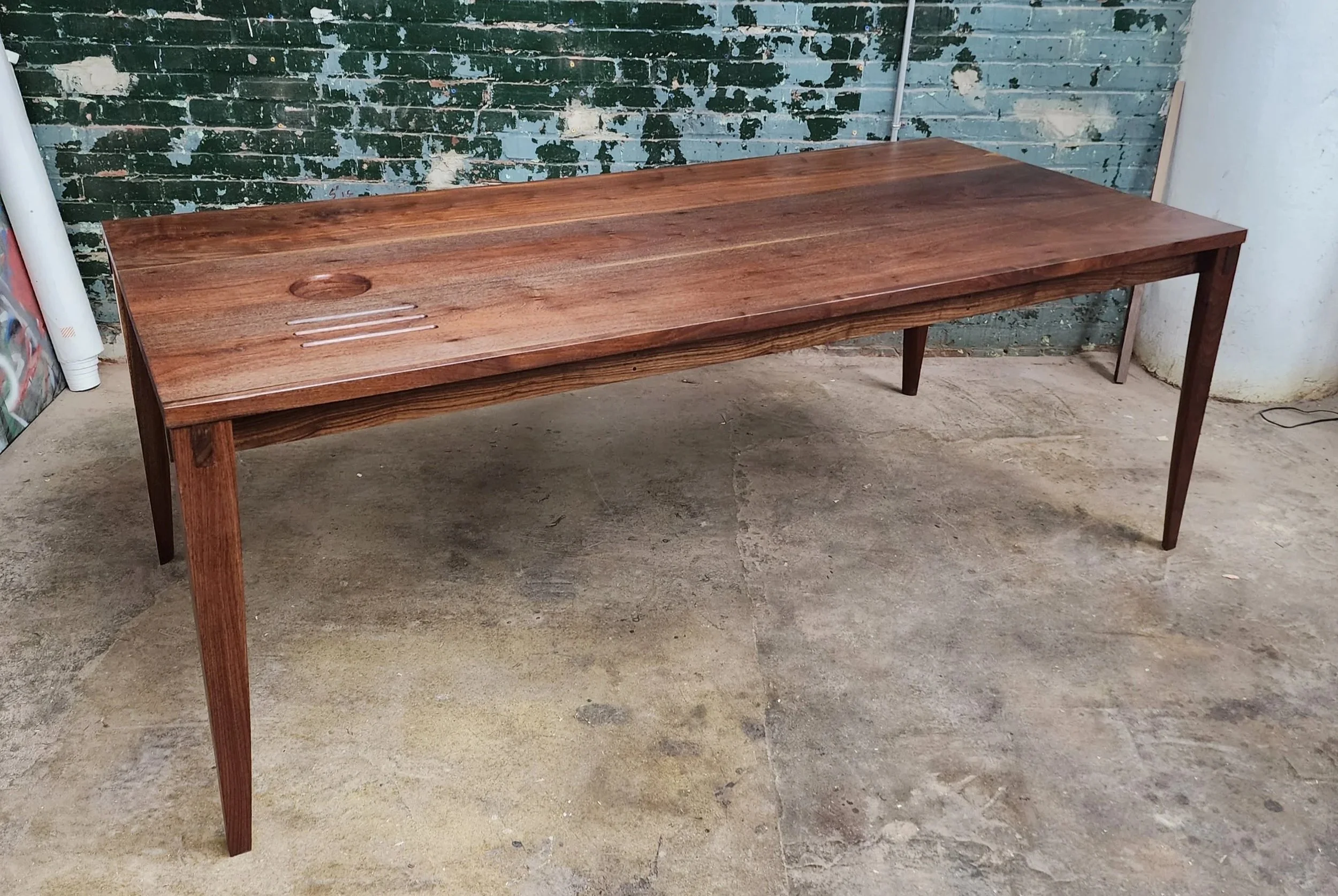 Modern walnut nightstand or side table. Features wireless charging for your phone. Place your phone next to the Osage Orange bowtie inlay for charging.